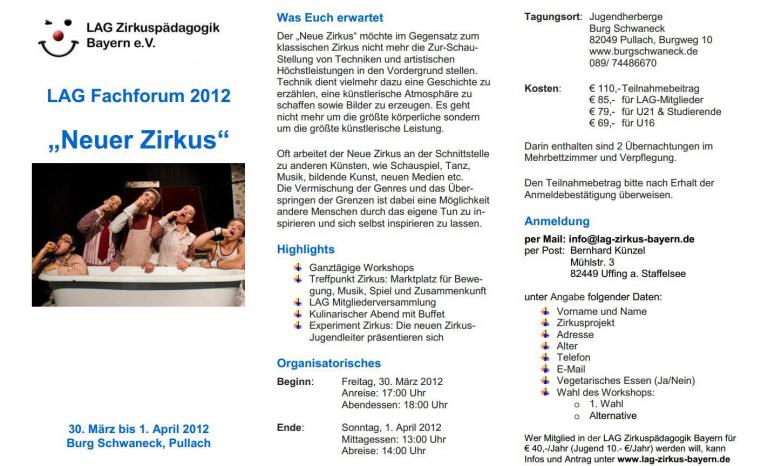 -  14. ZirkusforumWir bieten ein Wochenende mit Workshops, Infos und viel Raum zum freien Üben und Feiern. Hier begegnet sich die bayerische Zirkusszene. In diesem Jahr steht die Bühne im Vordergrund. Wir starten mit der Frage wie das Publikum in eine Show gut eingebunden werden kann und erleben das natürlich live.