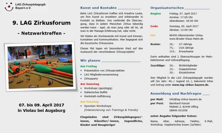 -  9. Zirkusforum 2017vom 7. - 9. April 2017 In Violau bei Augsburg Dieses Mal legen wir besonderen Wert auf den Austausch der verschiedenen Zirkusprojekte!
