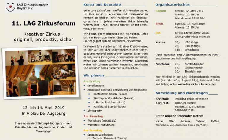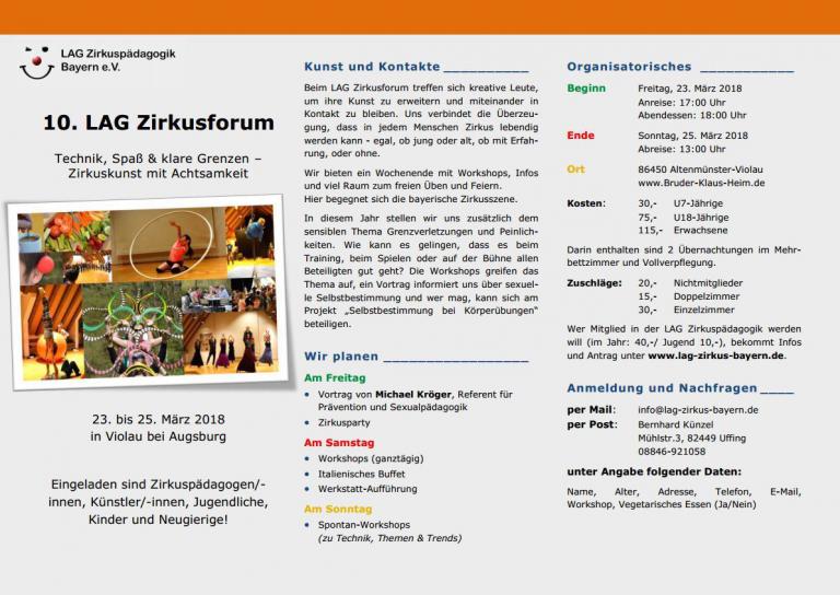 -  14. ZirkusforumWir bieten ein Wochenende mit Workshops, Infos und viel Raum zum freien Üben und Feiern. Hier begegnet sich die bayerische Zirkusszene. In diesem Jahr steht die Bühne im Vordergrund. Wir starten mit der Frage wie das Publikum in eine Show gut eingebunden werden kann und erleben das natürlich live.