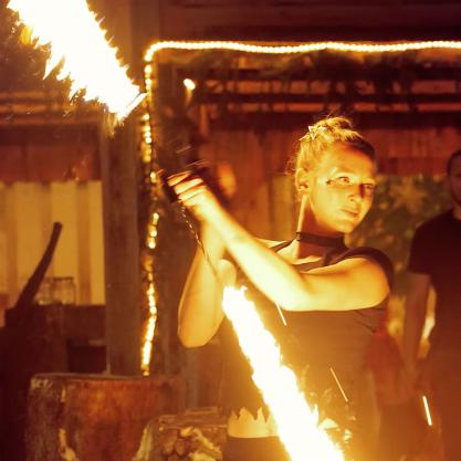 Eileen Fischer ist ehrenamtliche Zirkuspädagogin und leidenschaftliche Feuerspielerin. Auf Conventions und Festivals entwickelt sie ihre Zirkuskünste kontinuierlich weiter. In Landsberg leitet sie den Kinderzirkusverein Zirkusvirus.