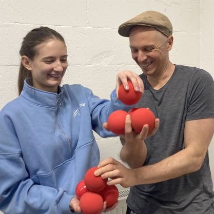 Melina Gaffron und Jens Fissenewert vermitteln einsteigerfreundliche Ball-Jonglage. Im Mittelpunkt stehen Solo- und Duotricks sowie Ideen für gemeinsame Gruppenbilder.